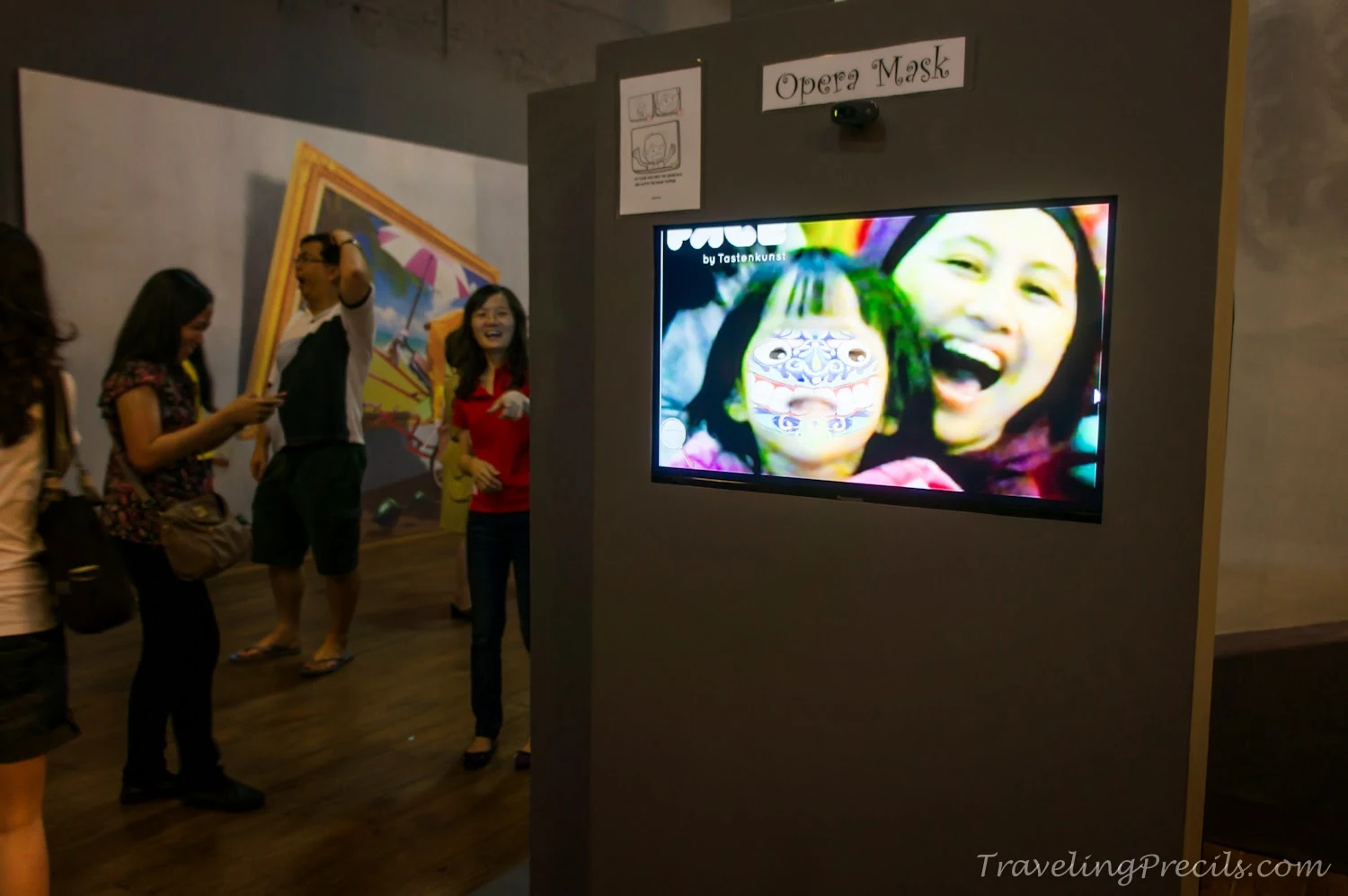 Selain lukisan-lukisan, ada layar interaktif yang bisa membuat kita memakai topeng atau menghias wajah kita dengan fitur aneh-aneh.