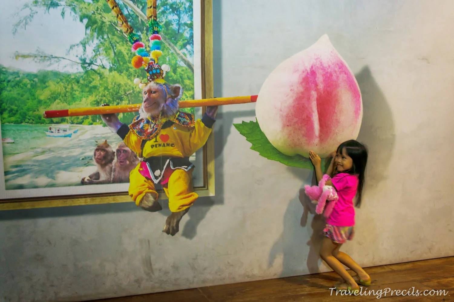 Di lantai 2, pengunjung bisa lebih banyak berinteraksi dengan display lukisan 3D khas Penang. Konseptor museum ini tahu benar kalau sekarang turis ingin berfoto dan berbagi di media sosial. Itu dimanfaatkan untuk membuat karya seni yang bisa diajak bermain-main. Di setiap lukisan diberi contoh-contoh bagaimana kami bisa berpose.